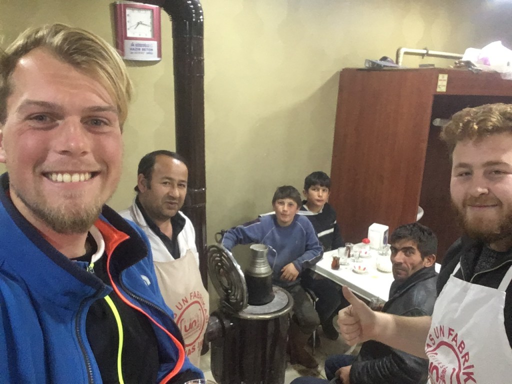 Ich brauchte zudem dringend etwas warmes zu essen und mir war ebenso nach türkischer Pizza (Lahmacun). In einem nahegelegenen Restaurant traf ich beim Bestellprozess auf Abdul Hamid, welcher mich direkt auf Lahmacum einlud. So cool – diese (sommer-)warme Gastfreundschaft! Wieder einmal erwies sich Google Translator als die einzige Möglichkeit, um überhaupt eine Konversation führen zu können. Nach dem Abendessen wollte er mir noch einen seiner Brüder vorstellen und so fand ich mich kurze Zeit später in einem traditionellen Teehaus wieder. Neben Tee, bekam ich auch ganz meinen Sehnsüchten nach warmen Getränken entsprechend, heiße Milch serviert. Anschließend machten wir noch eine Spritztour durch die Schneematschstadt Zara (die Pfützen waren teilweise bis zu 50 cm tief..).